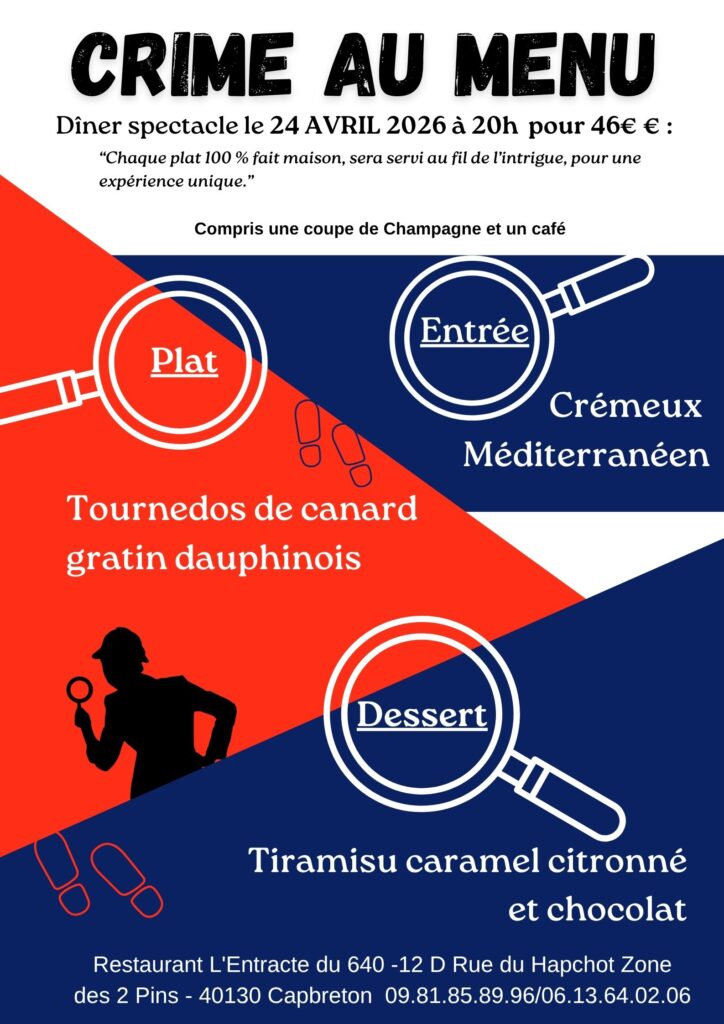 DINER SPECTACLE – CRIME AU MENU – CAPBRETON – vendredi 24 avril 2026