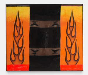 Visuel : Artefact-1 (Flames of the origins), 200x230cm, acrylique, carton, tissu ancien, masque africain, résine sur toile, 2023. © Hioco Delany