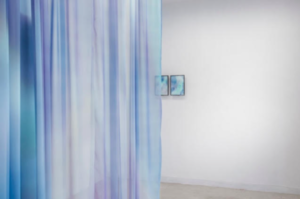 Visuel : Brume-coeruleum mauve irisé, 2025, impression sur verre, vitrail, cadre acier et aluminium, I mist you,2024, impression sur tissu mousseline, dimensions variables© Station V