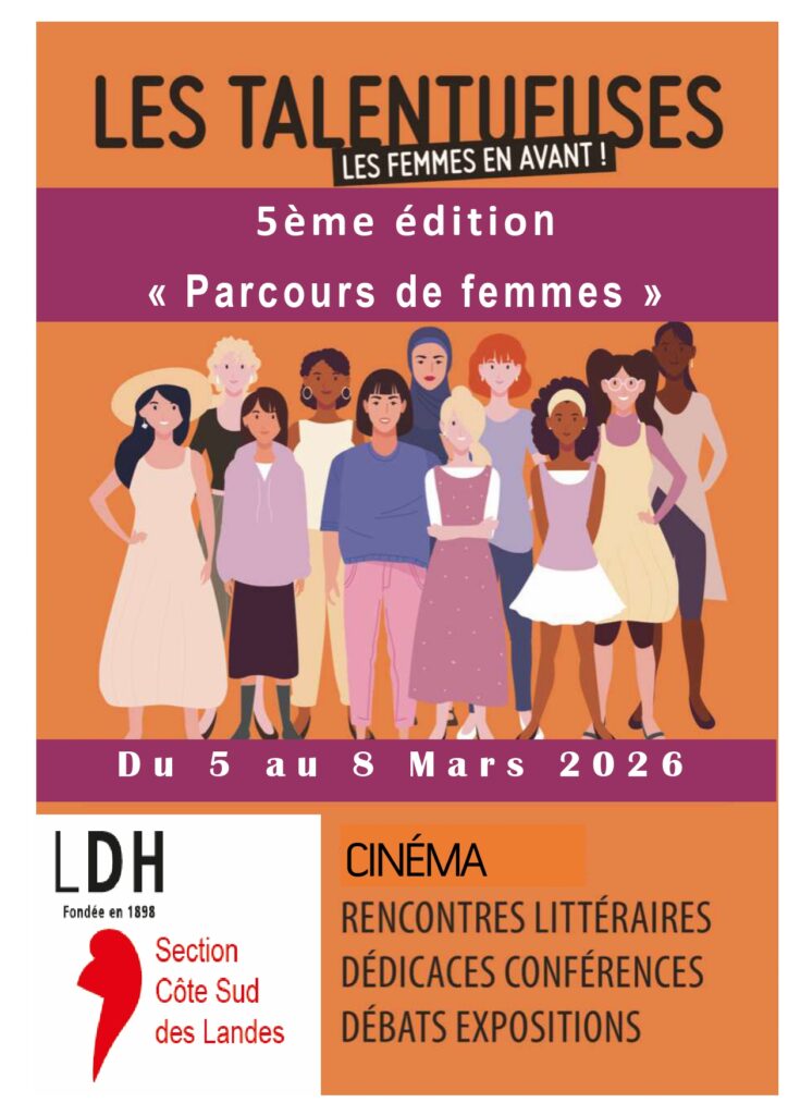 5ème édition LES TALENTUEUSES « Parcours de femmes » du 5 au 8 mars à ST VINCENT DE TYROSSE organisée par la LDH Rencontres littéraires Dédicaces Conférences Débats Expositions Programmation complète en cliquant ici : Programme edition V.pub