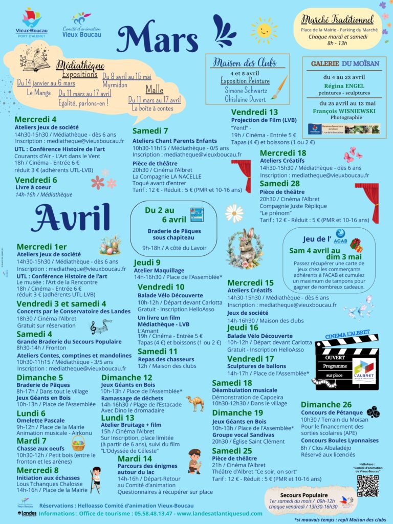 PROGRAMME ANIMATIONS VIEUX BOUCAU mars et avril 2026 Voici donc le nouveau programme ICI : PROGRAMME MARS AVRIL Def